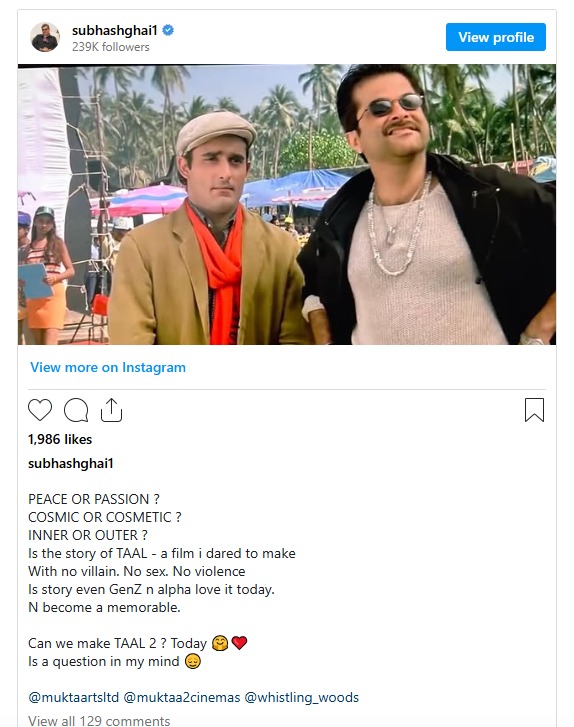 सुभाष घई ने हाल ही में इंस्टाग्राम पर अक्षय खन्ना और अनिल कपूर की एक तस्वीर साझा करते हुए जेन-जी और अल्फा पीढ़ी से सवाल पूछा कि क्या वे आज भी बिना किसी विलेन और बिना हिंसा वाली ऐसी प्रेम कहानी को पसंद करेंगे? उन्होंने पूछा, “क्या हम आज ‘ताल 2’ बना सकते हैं?” इस सवाल ने इंटरनेट पर फैंस के बीच उत्साह भर दिया।