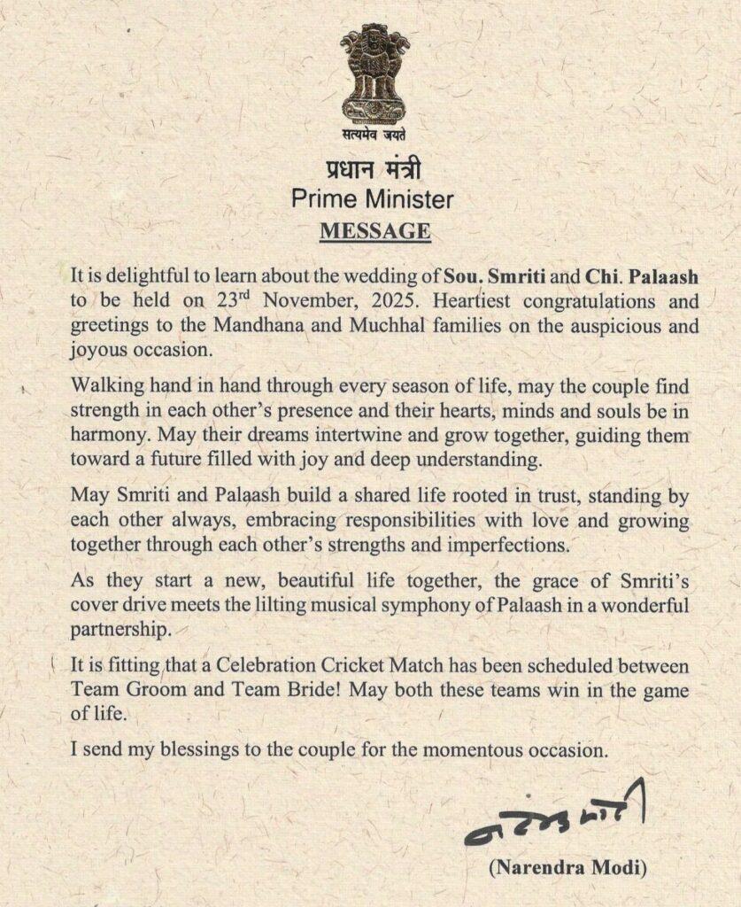 पीएम मोदी के इसी पत्र से स्मृति और पलाश की शादी की तारीख, 23 नवंबर, भी सार्वजनिक हुई है, जिसे कपल ने अब तक गोपनीय रखा था। स्मृति मंधाना के लिए यह दौर उनके करियर के शिखर पर आया है, जब उन्होंने हाल ही में भारतीय महिला टीम को पहली आईसीसी महिला वनडे वर्ल्ड कप जीत दिलाने में महत्वपूर्ण भूमिका निभाई है।